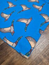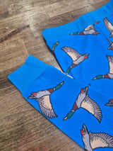 Flying mallard duck print on deep blue