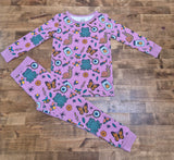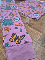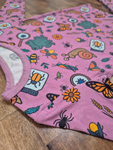 Turn bedtime into a backyard adventure! This two-piece bamboo pajama set is covered in all the fun critters kids love to discover—frogs, snails, butterflies, bees, fireflies, and more—against a playful mauve background. With magnifying glasses and mason jars sprinkled into the design, it’s the perfect set for little explorers who dream of catching fireflies and chasing bugs.