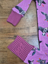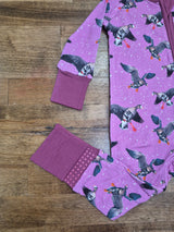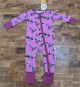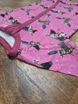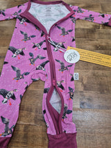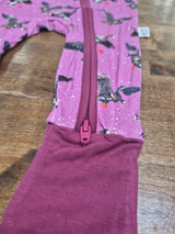 Bring the marsh to bedtime with our Specklebelly Sky sleeper. Featuring beautifully detailed specklebelly geese in flight against a deep pink speckled background, this print is perfect for little ones raised in the outdoors.