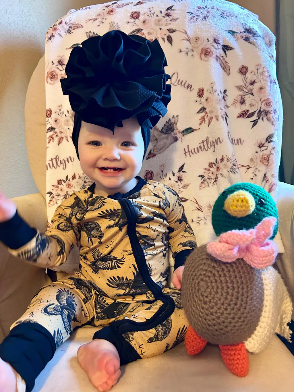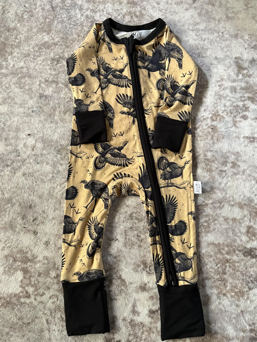 Built for the outdoors and soft enough for sweet dreams, our Wild Turkey Bamboo Sleeper is a cozy staple for little hunters in training. Featuring a bold flying turkey print on a warm tan background, this sleeper blends comfort, function, and style for every season.